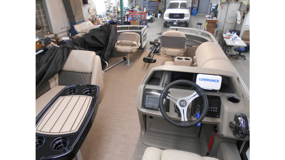 - 10' (3.05 m) SUN TRACKER® QuickLift™ Bimini top w/LED courtesy lights, storage pockets & protective boot (color-coordinated Black w/Charcoal fencing or Sand w/Indigo Blue fencing)