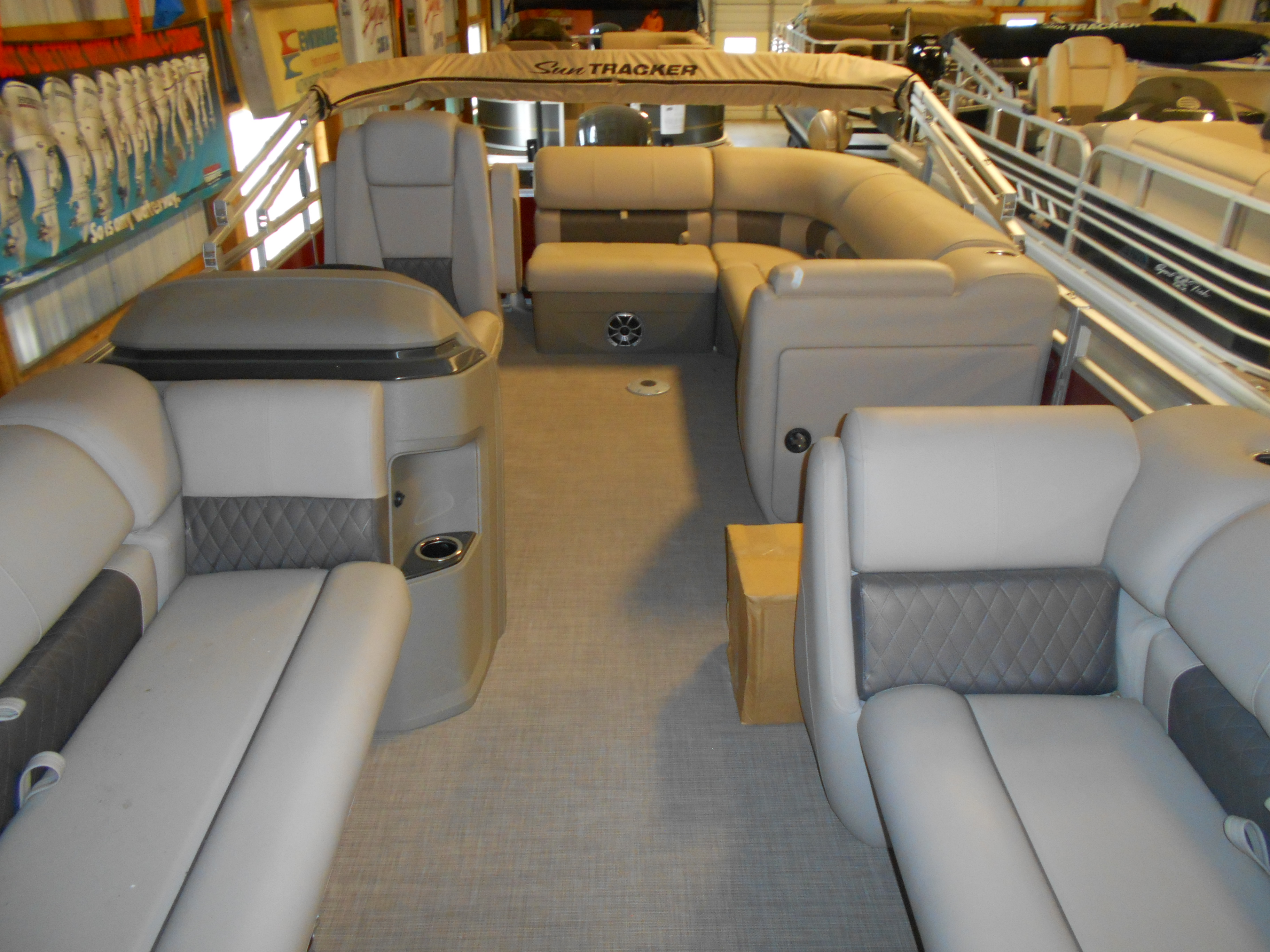 This PARTY BARGE® features the STOW MORE™ system, which puts storage spaces under the seats and behind the seat-back cushions of the 2 comfortable couches and L-shaped aft lounge. The couches and lounge feature 2 movable drink holders and a removable table with extra drink holders. The captain's chair reclines and boasts self-leveling arms for comfort.